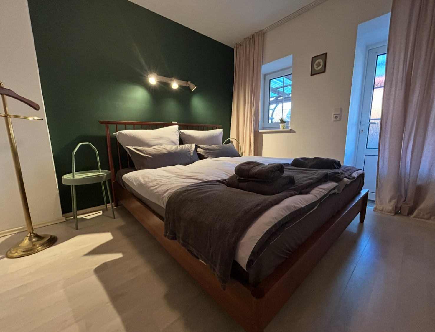 Unsere Ferienwohnung "Storchennest" mit separatem Schlafraum, großzügigem Badezimmer mit bodengleicher Dusche und einem Wohnraum mit offener Küche befindet sich im Erdgeschoss und ist ebenerdig erreichbar. Vor der Ferienwohnung steht ein kleiner privater abgezäunter Bauerngarten-Bereich mit überdachter Terrasse zur Verfügung, sowie Gartenmöbel und zwei Liegen mit Blick ins Grüne.